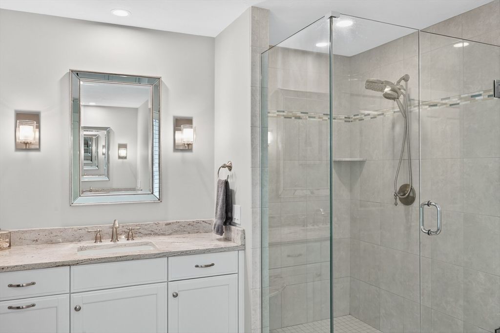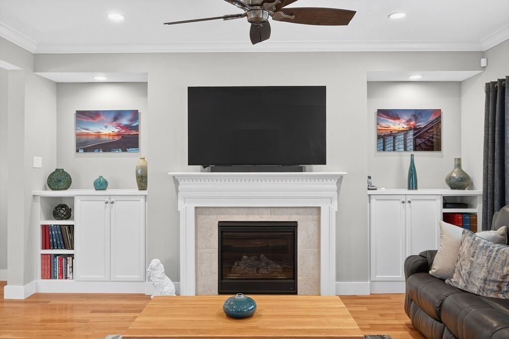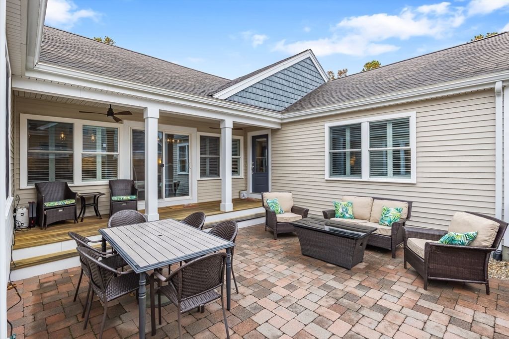 Spectacular and pristine "Fresco 3" style home in sought after Chadwick Corner in The Pinehills. An enchanting private courtyard with a covered porch leads you to the front door and side slider. This open floor plan with custom window treatments and hardwood floors throughout the main floor living space includes a living room with a gas fireplace, dining room, an upgraded kitchen with custom cabinets, quartz countertops and large pantry. A private primary suite on the first floor with 2 spacious closets, double vanities & dressing areas highlighted by the custom tiled shower. A guest bedroom, a full bath, a laundry room and a back deck complete the first floor. The second level has a loft office/den with 3rd bedroom and full bath. Be sure not to miss the wonderfully finished lower level with luxury vinyl planking, with abundant storage, and slider access to backyard. Recessed lighting throughout. The HOA includes The Stonebridge Club pool, clubhouse, gym + tennis courts, and much more!