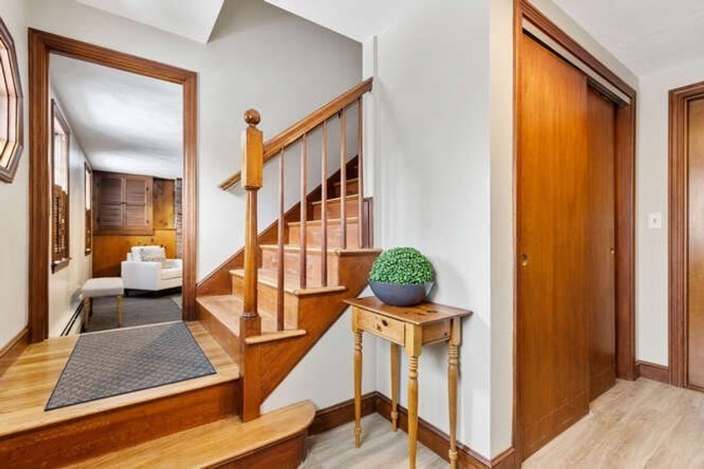 Charming Raised Ranch with gleaming hardwood floors and natural woodwork. Featuring a large fireplaced living room with a picture window that opens to eat in kitchen with built in hutch. The main level also includes three ample bedrooms all with nice closet space and a three-season sunporch. The entry level features an entry foyer and includes a fireplaced family, three quarter bath, laundry area with wet sink and an oversized garage. Good in-law potential. Conveniently located near the commuter rail with access to the major routes.